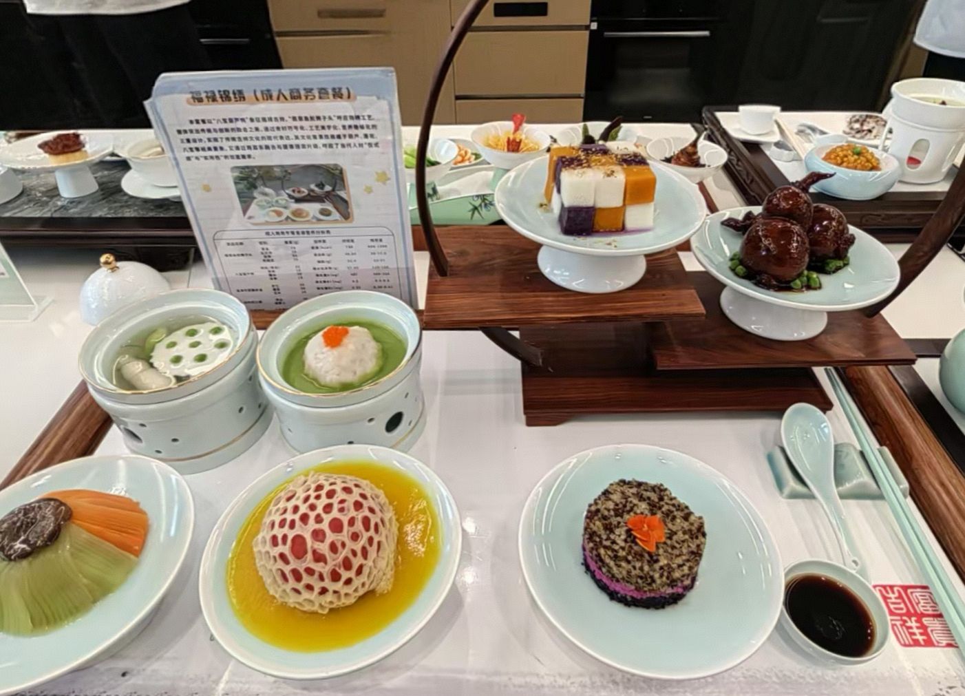 成人商务套餐“福禄锦绣”以象征福禄吉祥的“八宝葫芦鸭”与“翡翠鱼胶狮子头”相互呼应。在传承经典意象的同时,通过跨菜系融合与健康理念升级,满足了当代人对“仪式感”与“实用性”的双重需求。
