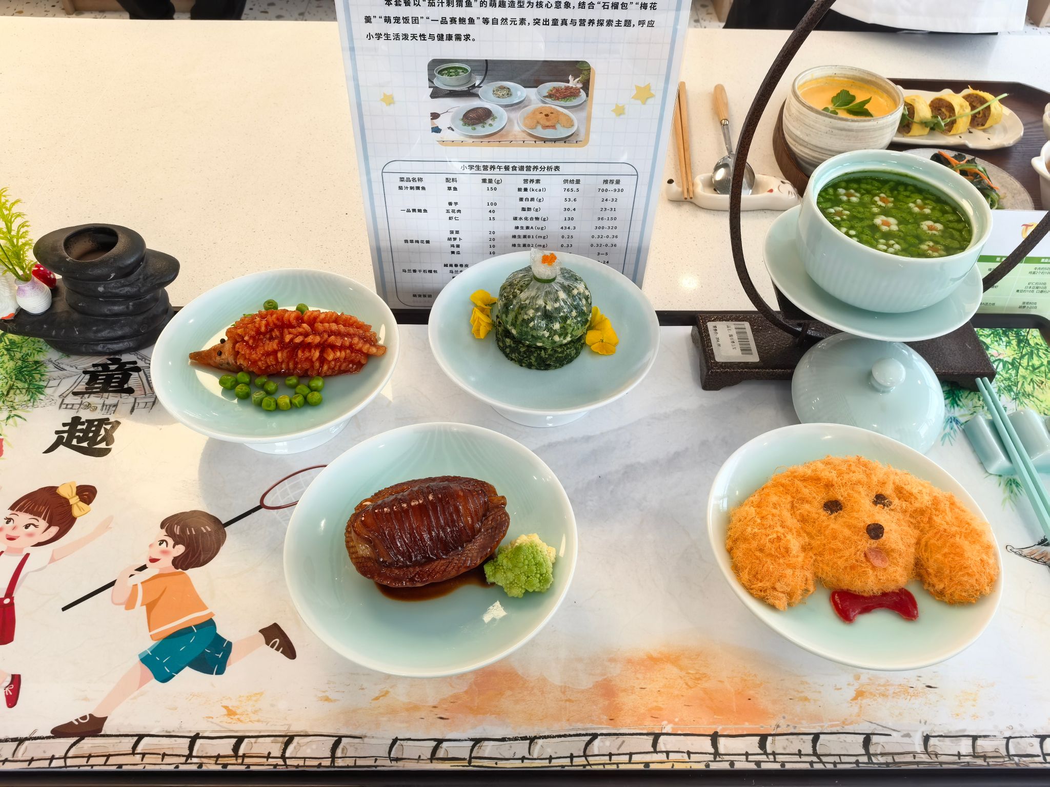 小学生营养套餐“童趣”则以“茄汁刺猬鱼”的萌趣造型为亮点,搭配“石榴包”“梅花羹”等充满自然元素的菜品,既贴合小学生活泼天性,又兼顾营养需求。
