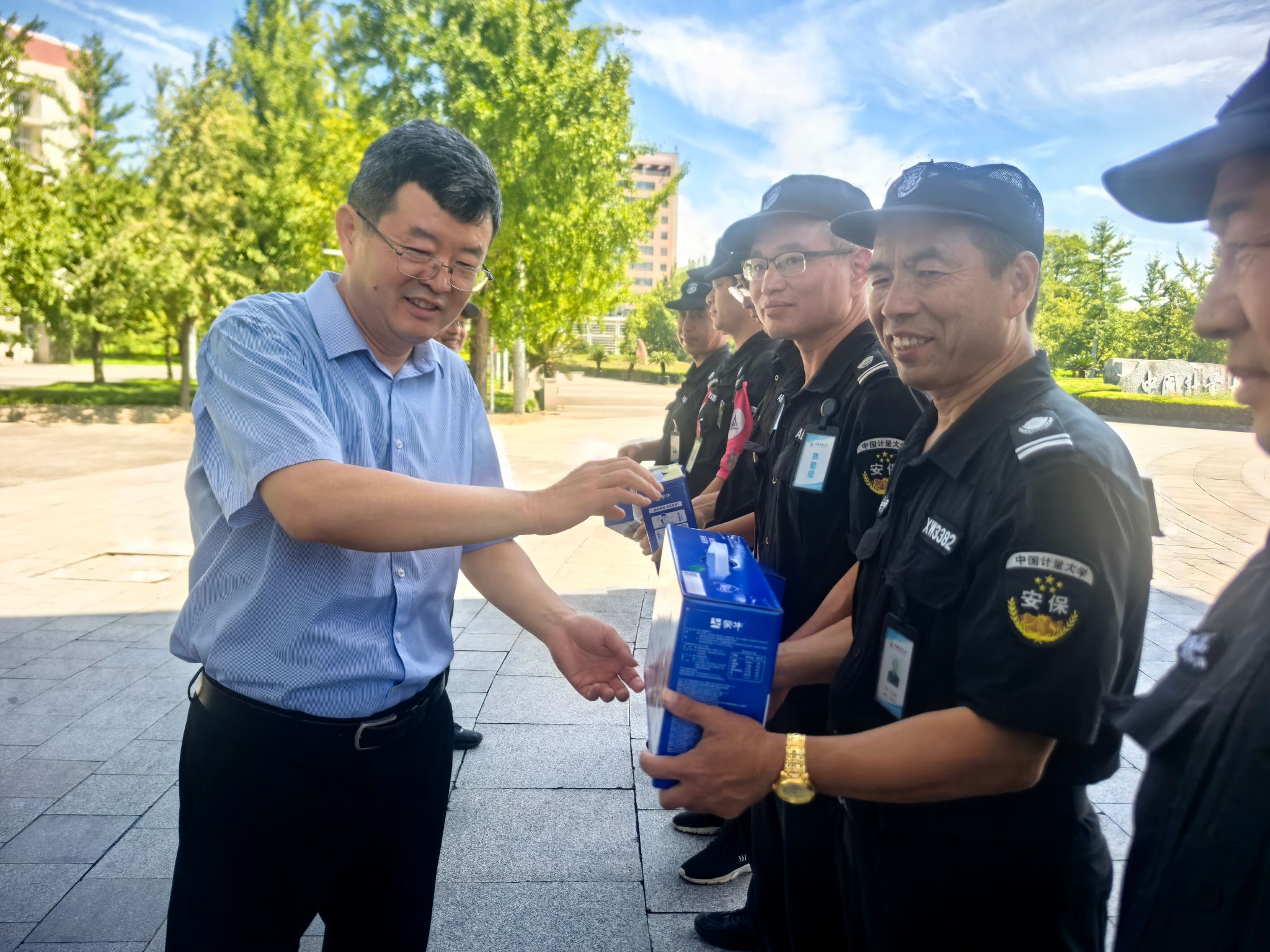 炎炎夏日,热浪袭人。8月8日,副校长王迪钊带队深入校园一线,看望慰问暑期高温下坚守保洁绿化、基建工程、安全保卫、公寓管理、餐饮服务等岗位的一线员工,给他们送上防暑降温慰问品。保卫部、校园建设处、后勤服务中心负责人参加慰问活动。