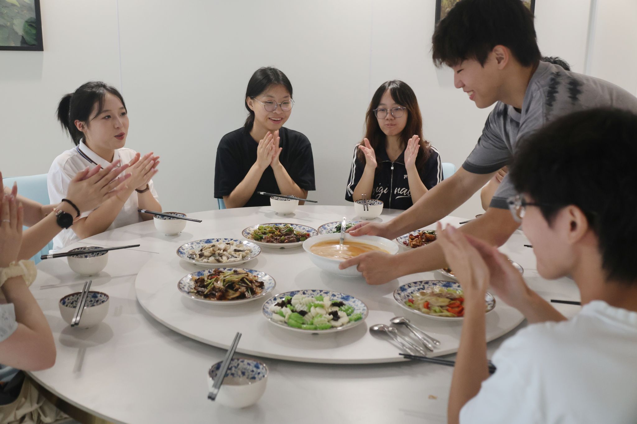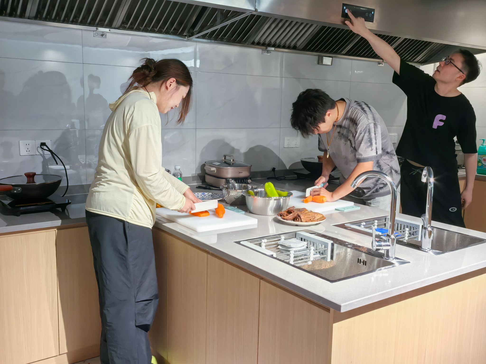 随后,在后勤服务中心联合校园建设处全新打造的“量小聚”共享空间,学生体验官刘胤杉及刘容申同学还亲自下厨,现场烹制了家乡特色菜“胡萝卜青椒炒牛肚”。师生代表们欢聚一堂,畅谈暑期的逸闻趣事,品尝自制美食及食堂小炒菜品。同学们纷纷表示“量小聚”共享空间为师生聚会提供了全新可能,“免费使用、餐具全包,真的太贴心啦”机电学院的高老师更笑着说道“特别有家的感觉,下次我们课题组聚会就安排上!”