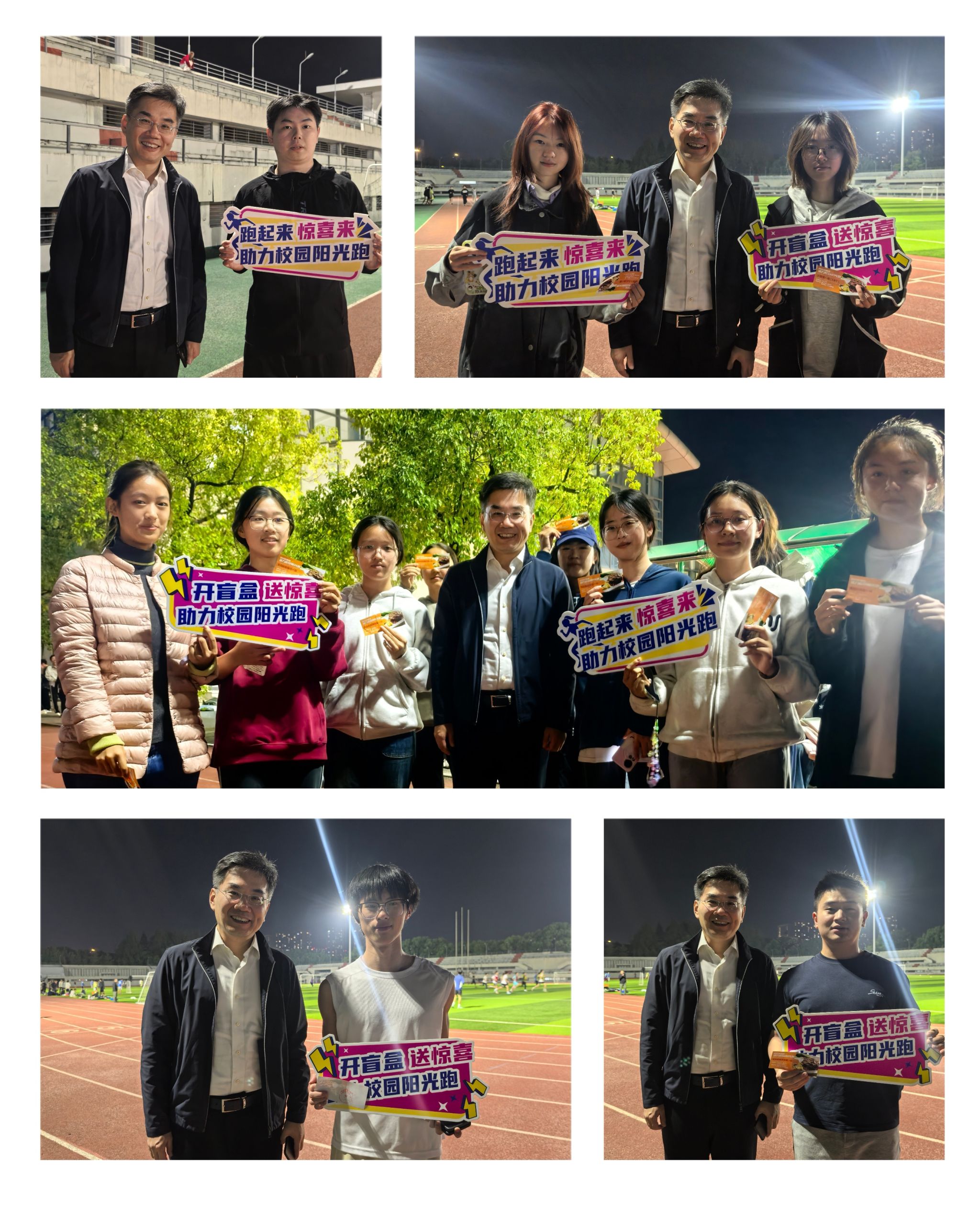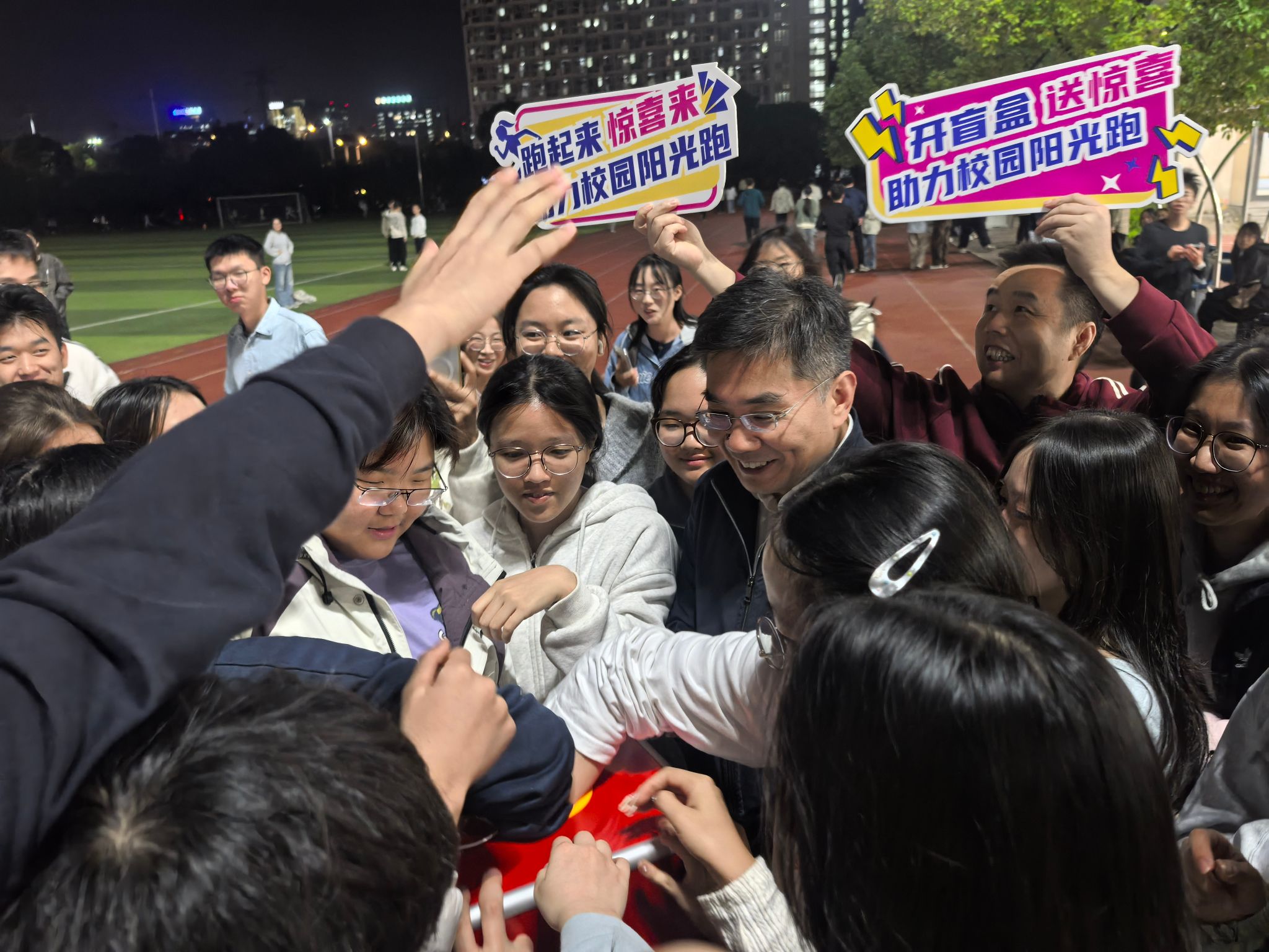 10月23日晚,由后勤中心与体军部联合开展的“开盲盒 送惊喜 助力校园阳光跑”活动正式启动。活动以“运动+美食”的创新形式,助力同学们点燃锻炼热情。副校长王斌锐化身“惊喜配送员”,在东、西校区田径场为运动中的同学们派送惊喜盲盒。后勤中心主任黄建湖、体军部主任陈刚、副主任李清等陪同参加了惊喜派送活动。
