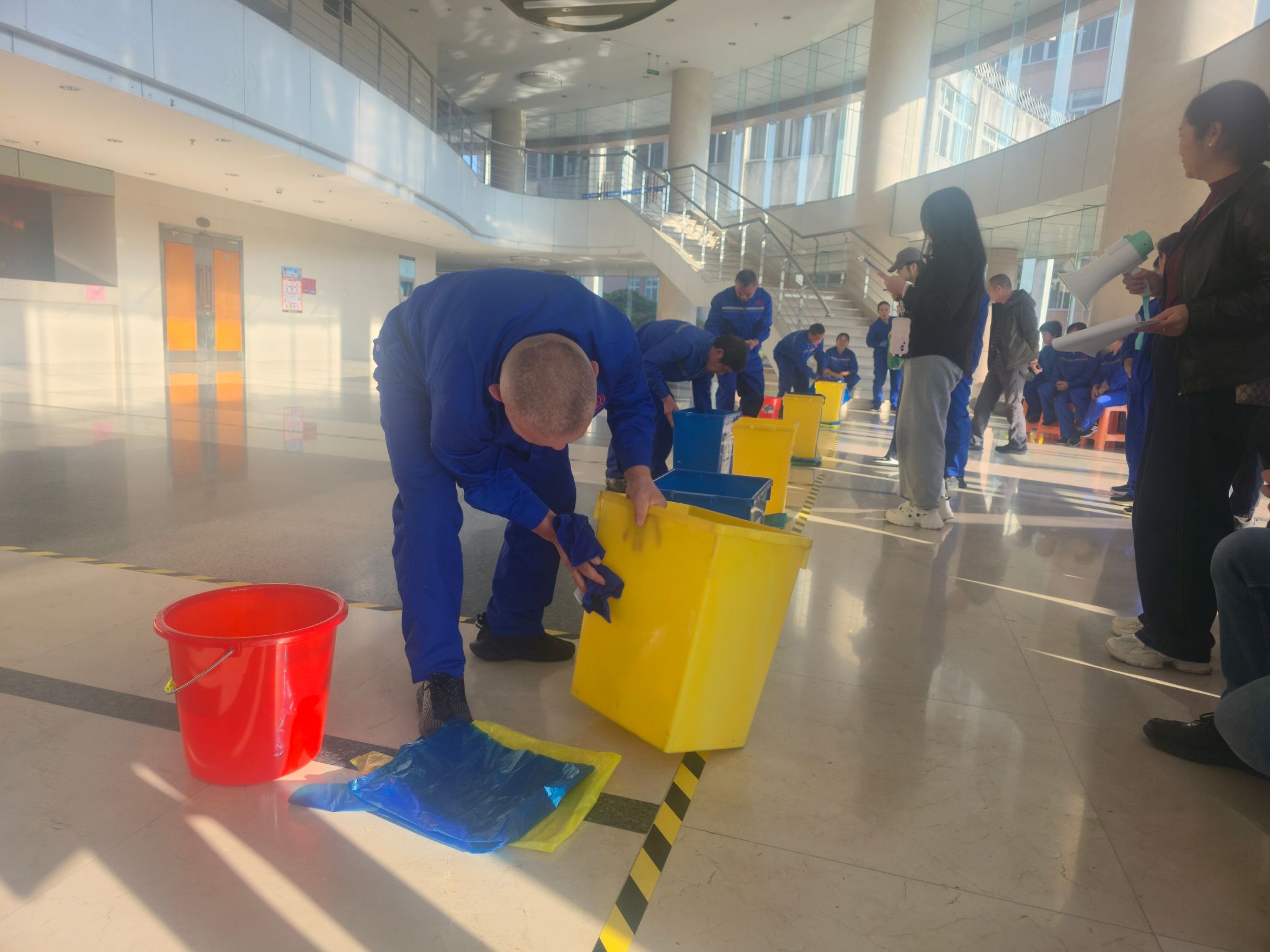 本次比赛聚焦保洁核心工作场景,设置室内地面除尘保洁、室外垃圾桶清洁两大项目,既紧贴岗位工作实际,又着重考察参赛选手技能熟练程度和操作规范性。赛事开始,选手们迅速进入状态,他们各展所长,熟练运用各类清洁工具和方法,严格遵循操作规范进行作业。无论是保洁工具的组装、地面除尘、垃圾分类,还是垃圾桶清洁与套袋,选手们以扎实的专业技能和严谨的工作态度,展现出对于作业效果的精益求精和对安全规范的严格遵守,体现了后勤保洁队伍过硬的素质。