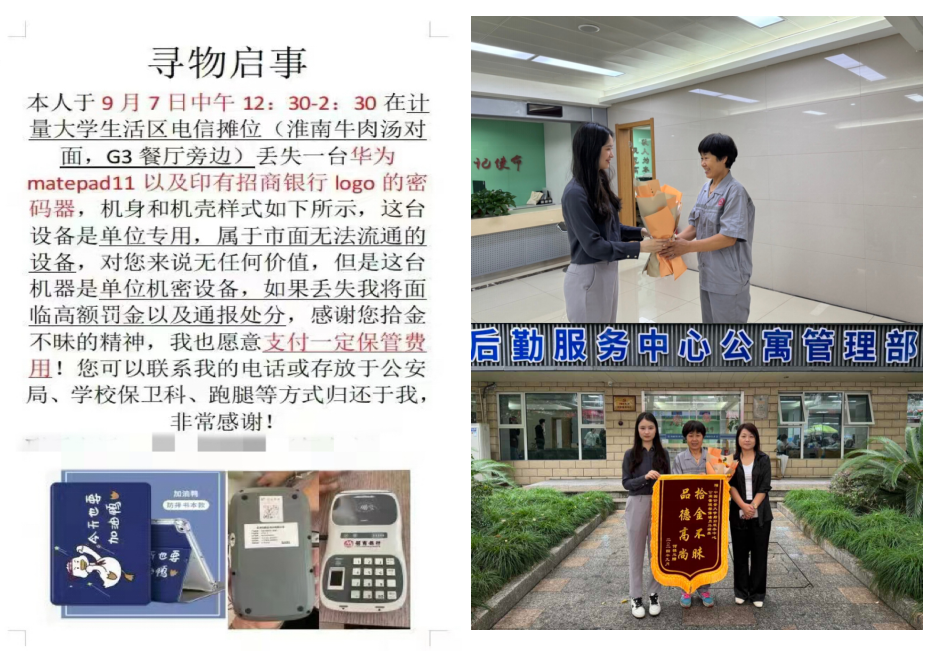 9月7日迎新当天,马瑞英在垃圾房分拣垃圾时发现一个袋子,当时已是深夜,出于职业的敏感性,她觉得这个物品非常重要,立即联系了清卫负责人上交物品并希望能尽快找到失主。在看到失主的寻物启事后,清卫负责人第一时间联系了失主,物归原主。作为一名银行职员,深知丢失银行密码器可能会对银行产生重大经济损失和不良影响,物品被清卫员捡到并第一时间归还,让她悬着的心放下了,焦虑和无奈瞬间化为感动,见到马瑞英后,她表达了深深的谢意,并不断称赞,中国计量大学的后勤员工素质高。