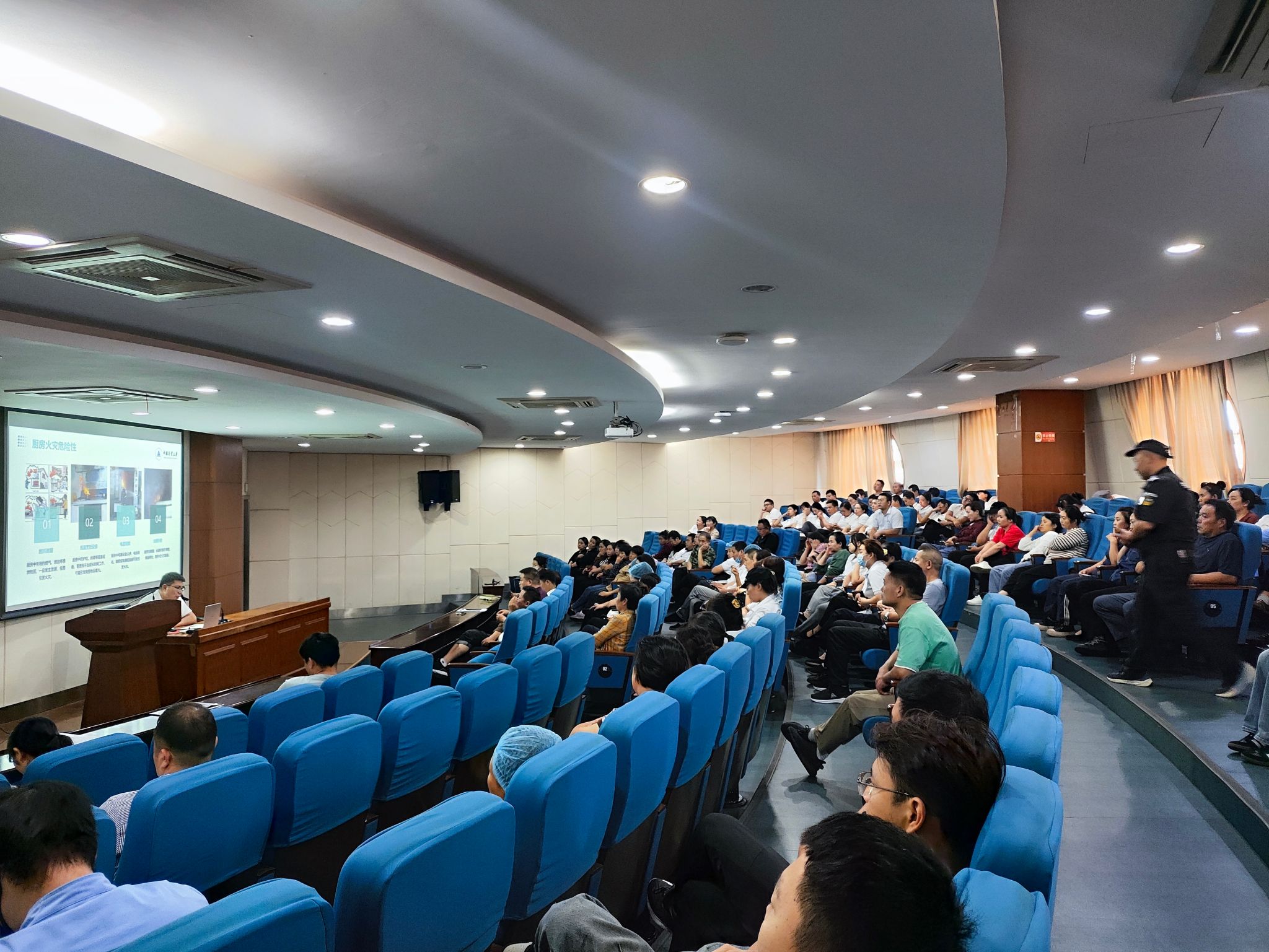 随后,朱永乐老师结合食堂工作特点,着重讲解了厨房消防安全隐患排查、初期火情扑救、应急人员疏散逃生等消防知识。并通过大量的典型事故案例,告诫大家消防安全工作应该“警钟长鸣”,责任重于泰山。
