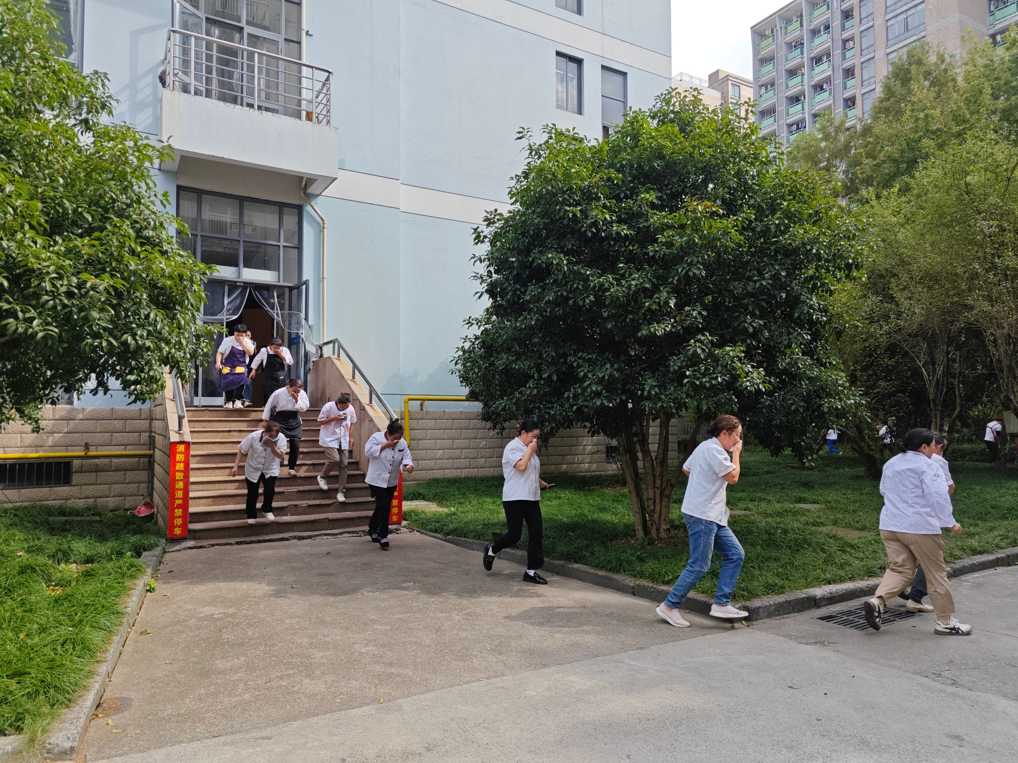 13:00,消防疏散演练在G3餐厅展开,后勤服务中心副主任朱然担任本次消防疏散演练总指挥。现场模拟餐厅地下室线路老化引发火情,随着警报响起,3个餐厅引导员按照应急预案迅速组织员工,捂住口鼻、弯腰低姿,快步撤离,整个演练现场紧张有序。