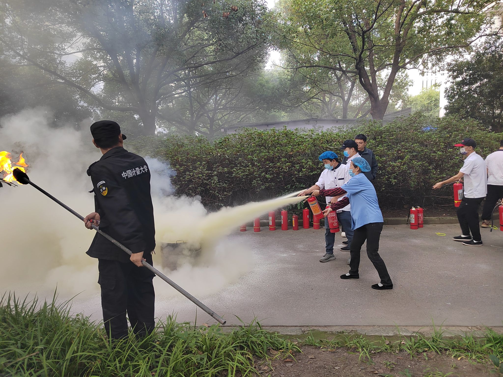 在疏散演练结束后,中心新进员工和餐饮全体工作人员参与了消防安全知识培训,并进行现场灭火实操体验。保卫处朱永乐老师分析了最新消防安全事故案例,同时讲解了消防安全的“四个能力”建设,详细演示了灭火器的正确使用方法,灭火演练现场,大家沉着冷静地按照“一提、二拔、三握、四压” 灭火器灭火步骤,精准地扑灭了火焰。