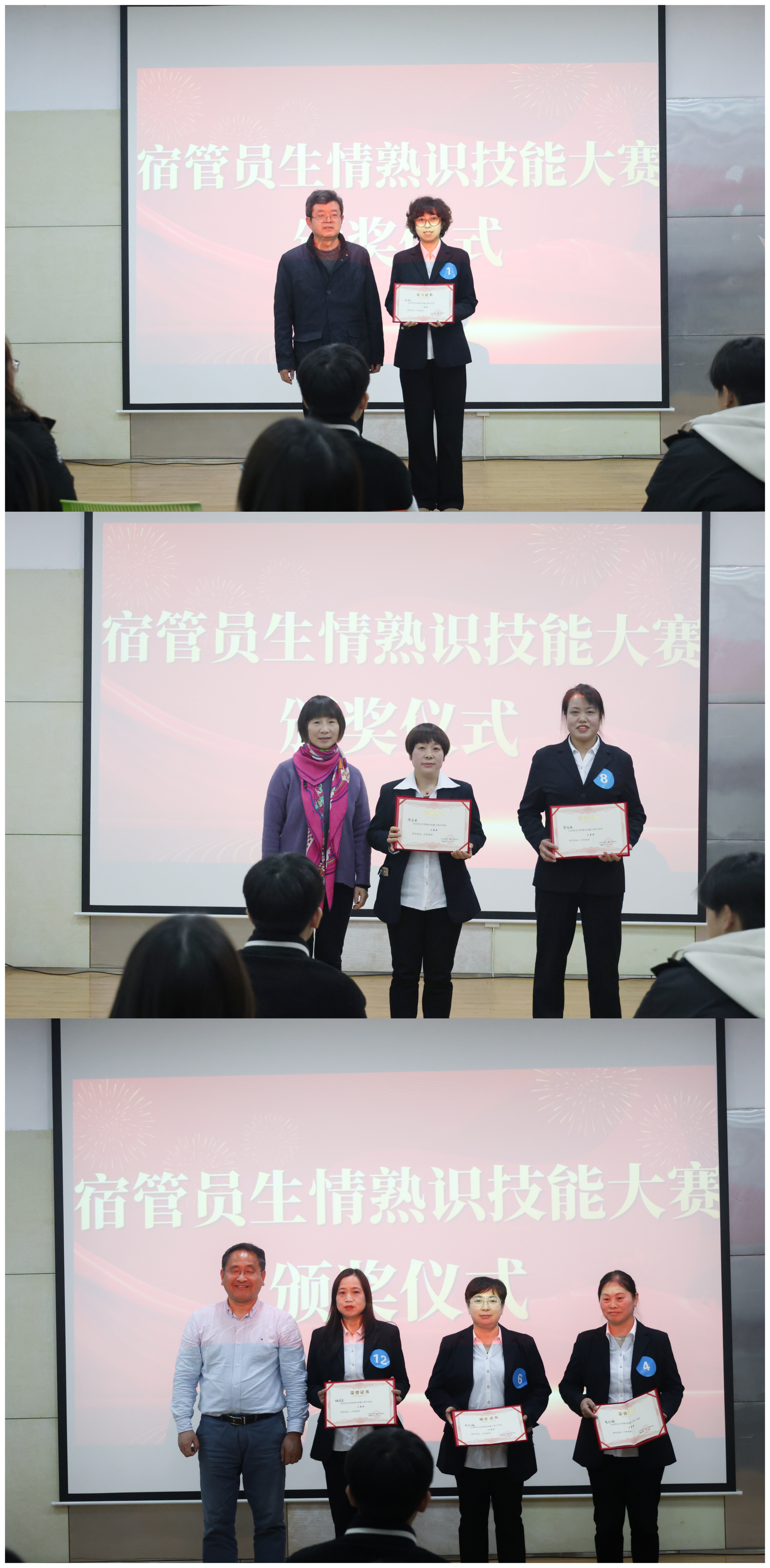 最终经过激烈的角逐,西区9号楼王冰获一等奖;西区1号楼邹俊英、西区7号楼周永安获二等奖;西区6号楼袁红梅、东区5号楼周永梅、东区2号楼杨清秀获三等奖。校党委委员副校长王迪钊和特邀观察评论员周泛海老师、毛成老师为获奖宿管员颁奖。