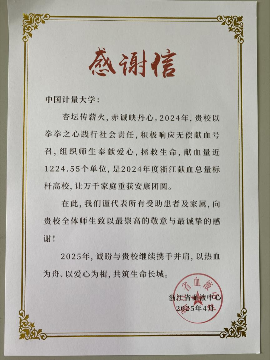 2025年4月22日,浙江省血液中心公布2024年度无偿献血标杆高校评选结果,我校再次荣获“无偿献血标杆高校”称号。这是我校继2023年度后第二次获此殊荣。