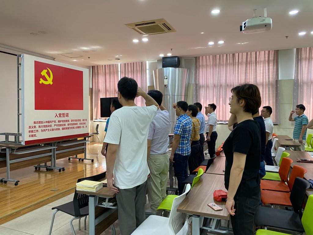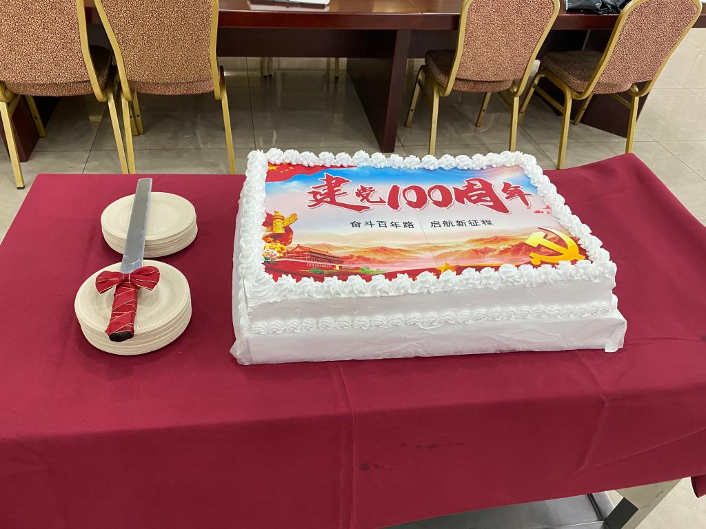 直播结束后,在党总支书记王勤的带领下,所有党员一起重温入党誓词,以宣誓仪式来庆祝党的生日。餐饮管理部还自制生日蛋糕,为党庆生。